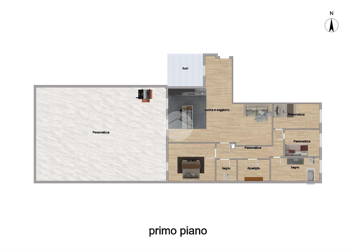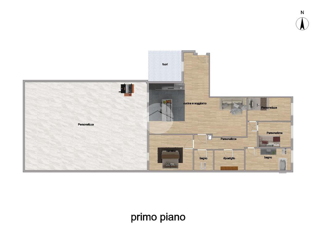 L’ingresso si apre su una luminosa zona giorno con cucina open space, con accesso diretto all’ampio terrazzo ideale per momenti all’aperto di relax o in famiglia.