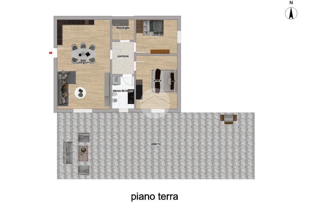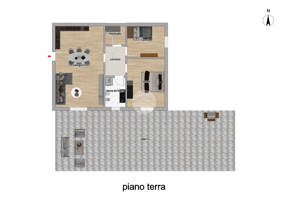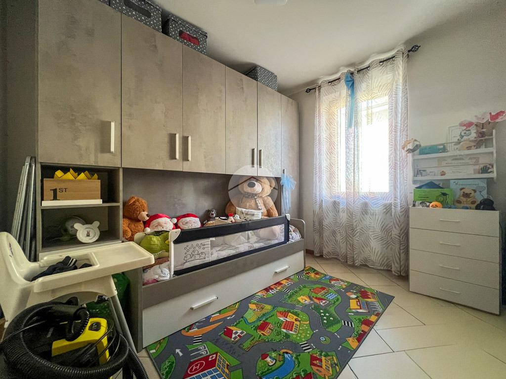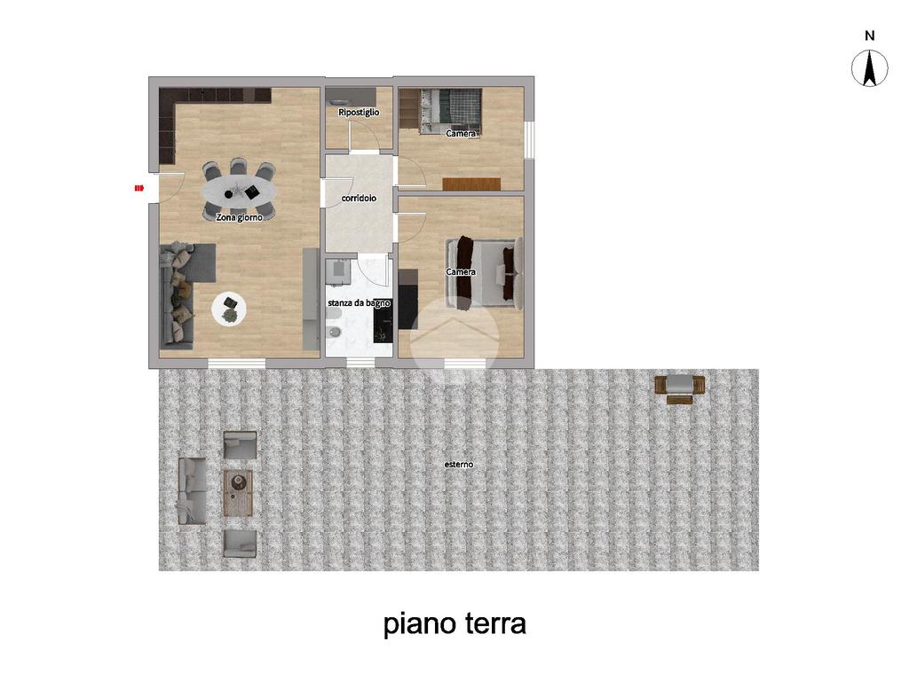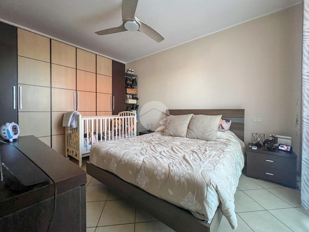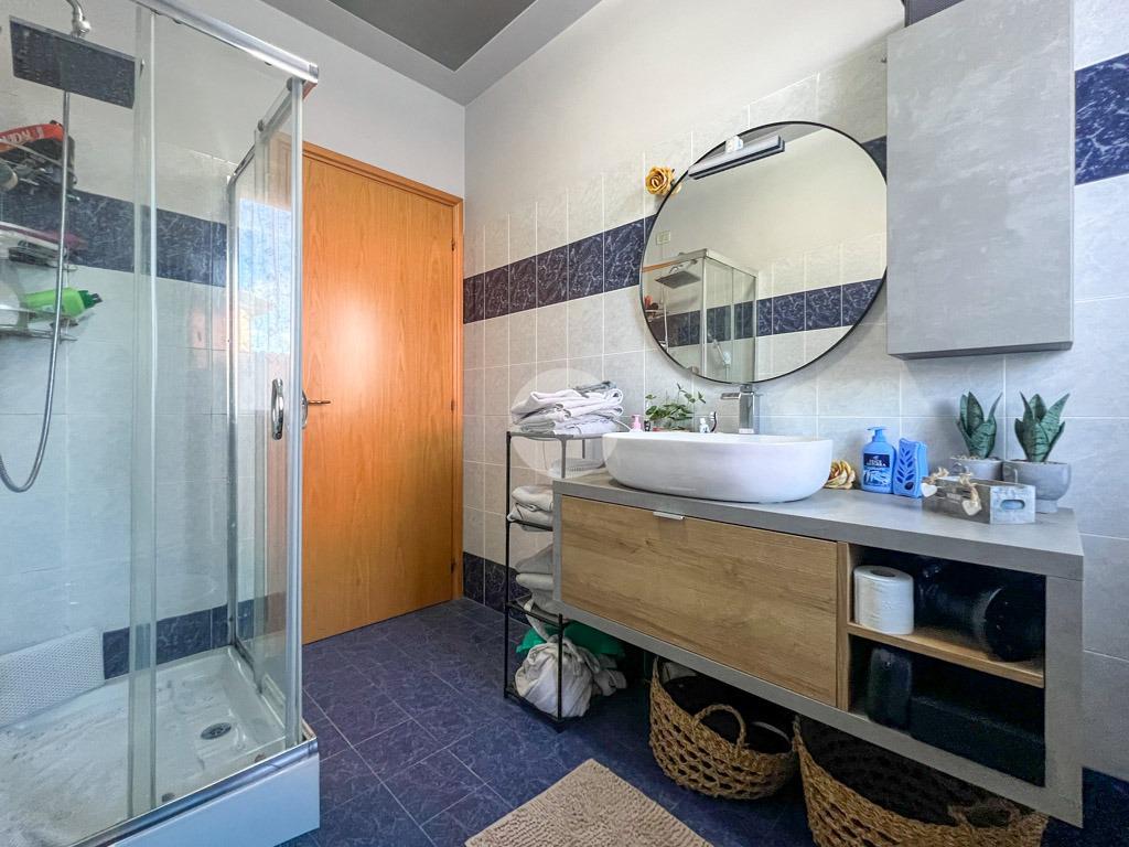 Tramite un disimpegno accediamo alla zona notte, composta da due camere da letto, di cui una dotata di porta finestra che concede l'accesso allo spazio esterno attualmente pavimentato, ideale per godere momenti di relax, e da un bagno finestrato dotato di box doccia.