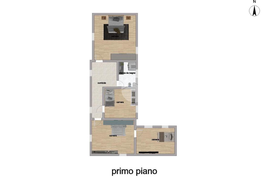 La zona notte, situata al primo piano, è composta da tre camere da letto di generose dimensioni e da un bagno finestrato completo di vasca, garantendo comfort e praticità.