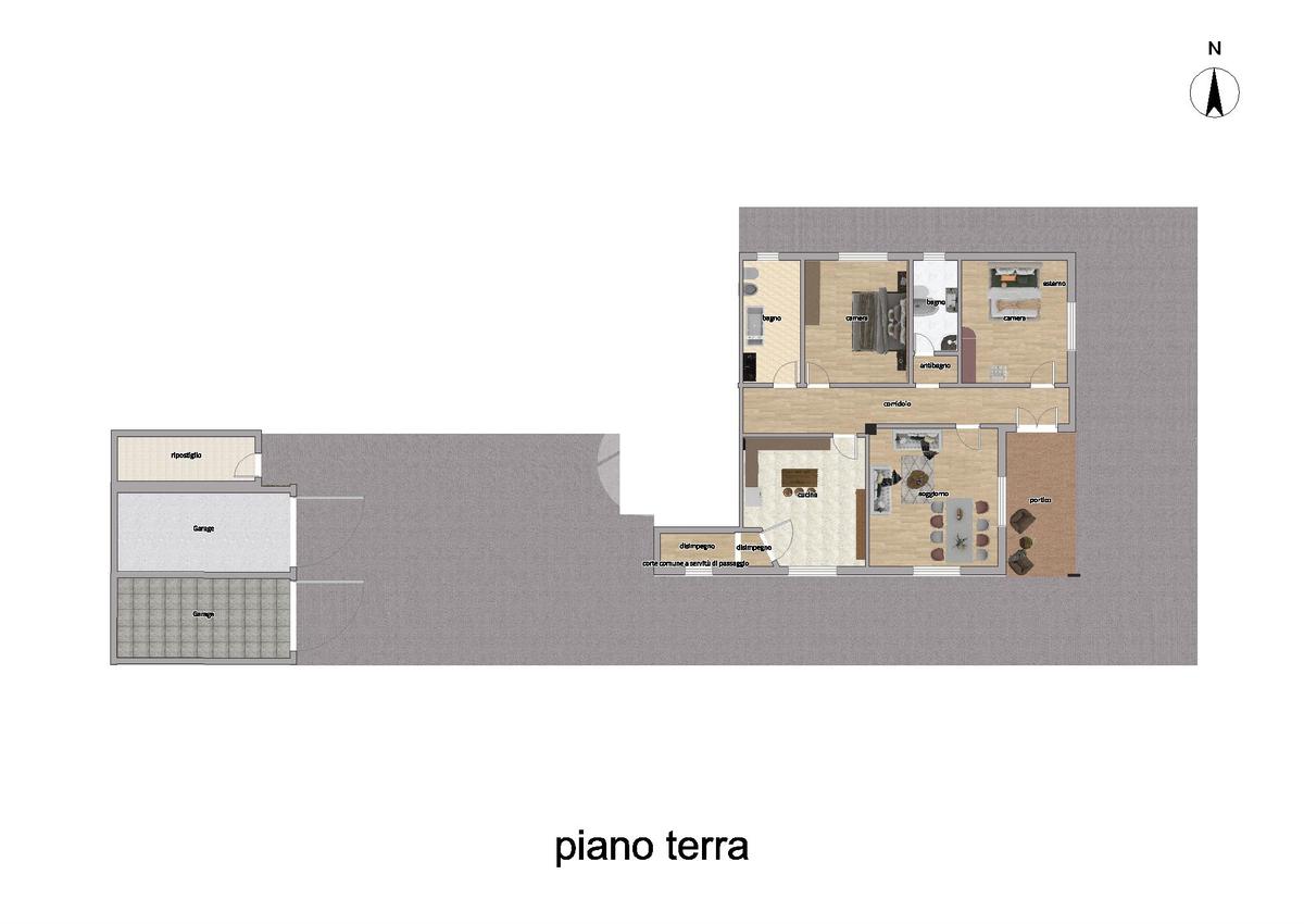 La soluzione si apre su un cortile di proprietà, perfetto per momenti all’aperto, esso ci conduce al piccolo portico coperto.