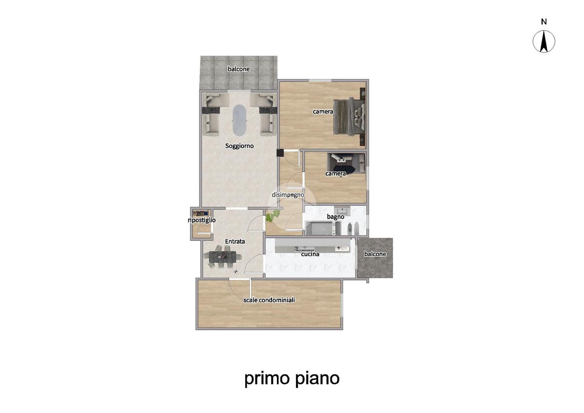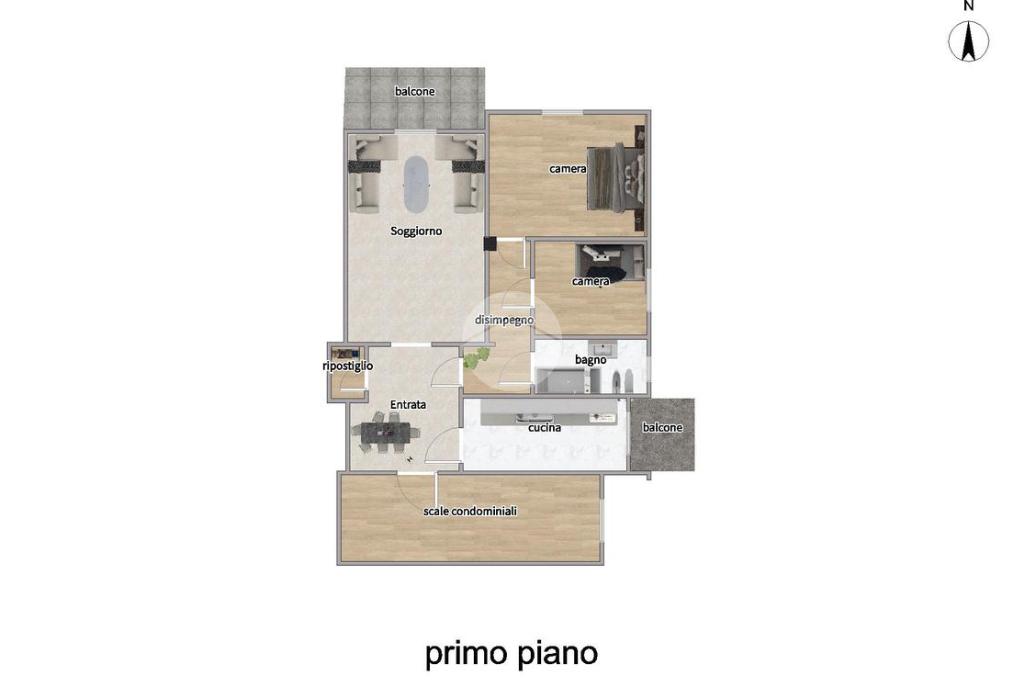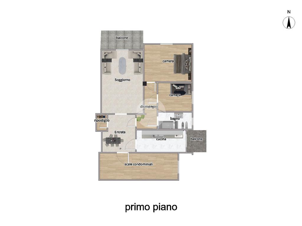 L’appartamento si apre su un ampio salone con accesso diretto al balcone, ideale per momenti di relax all’aperto.