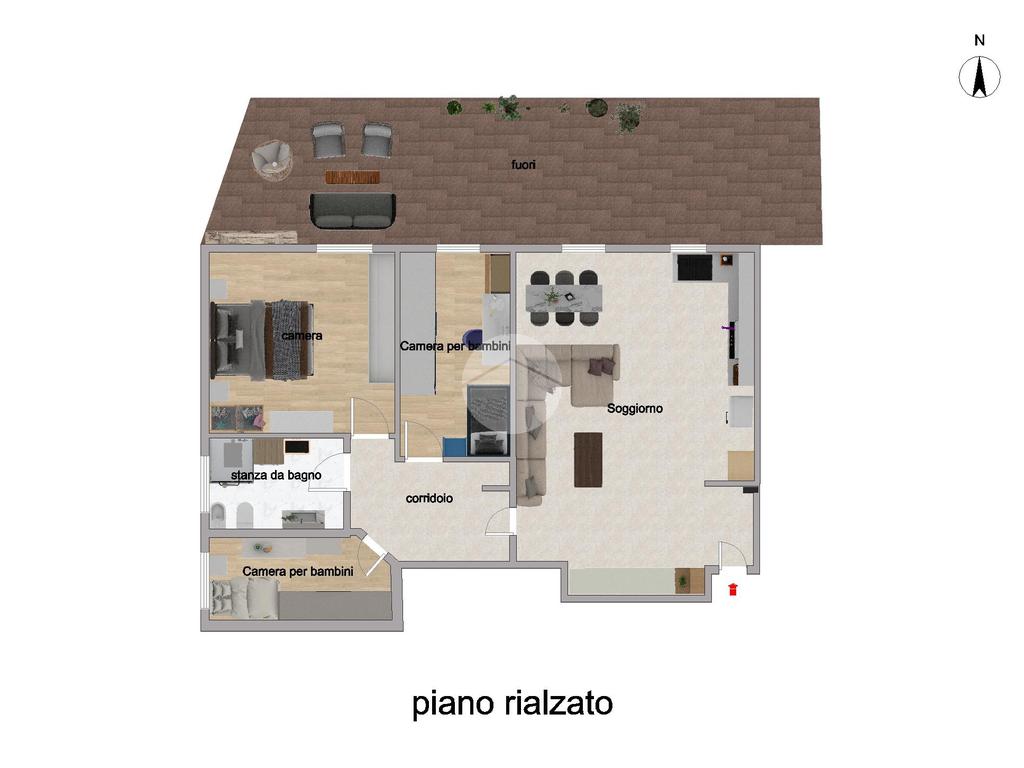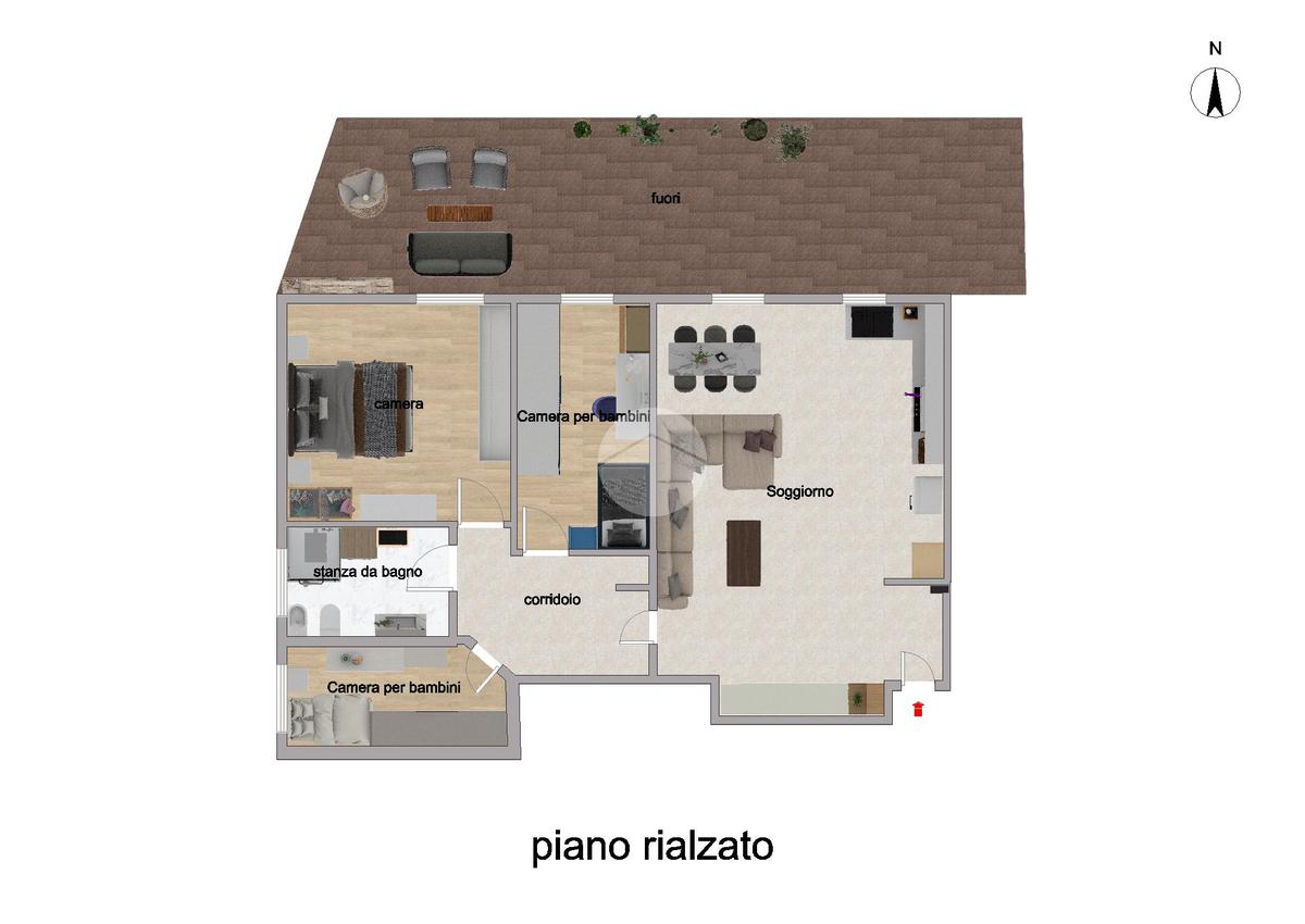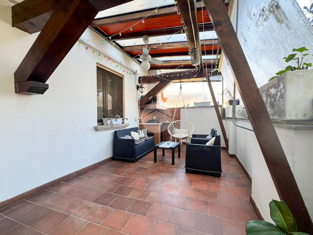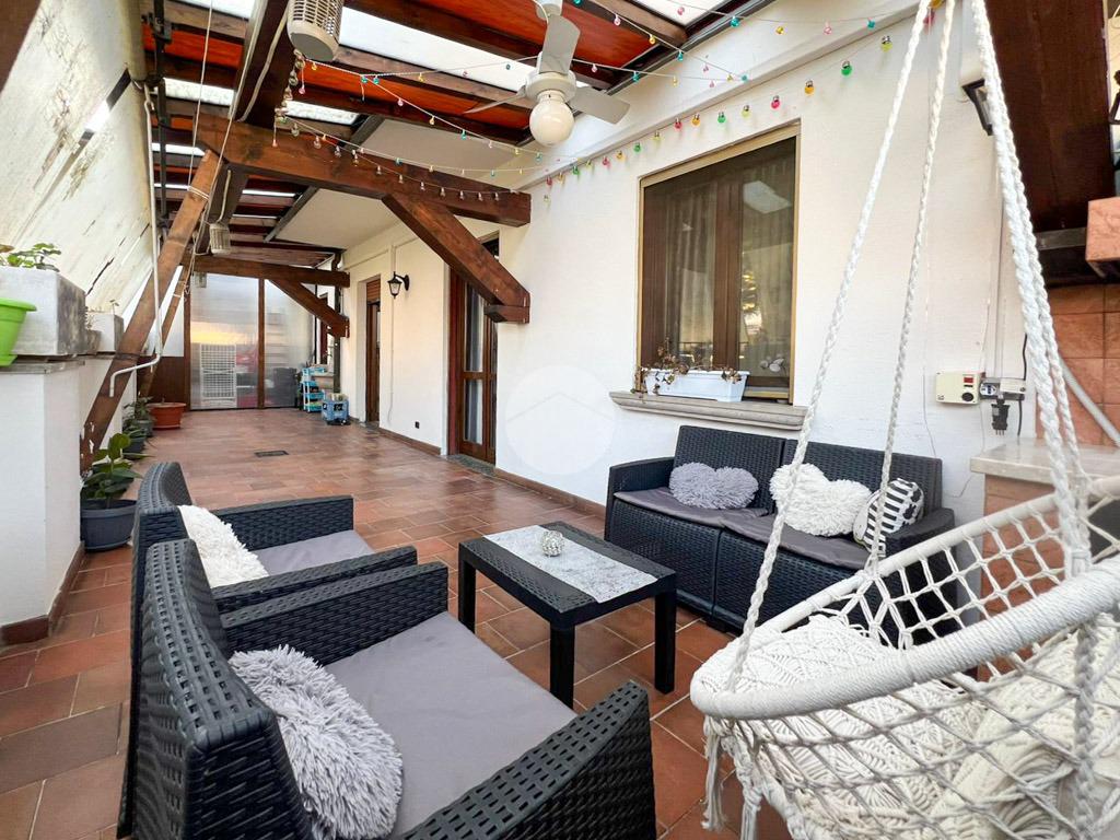 L’ingresso si apre su una luminosa zona giorno open-space con acceso diretto all’ampia terrazza sul retro, ideale per momenti di relax.