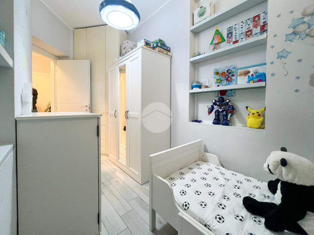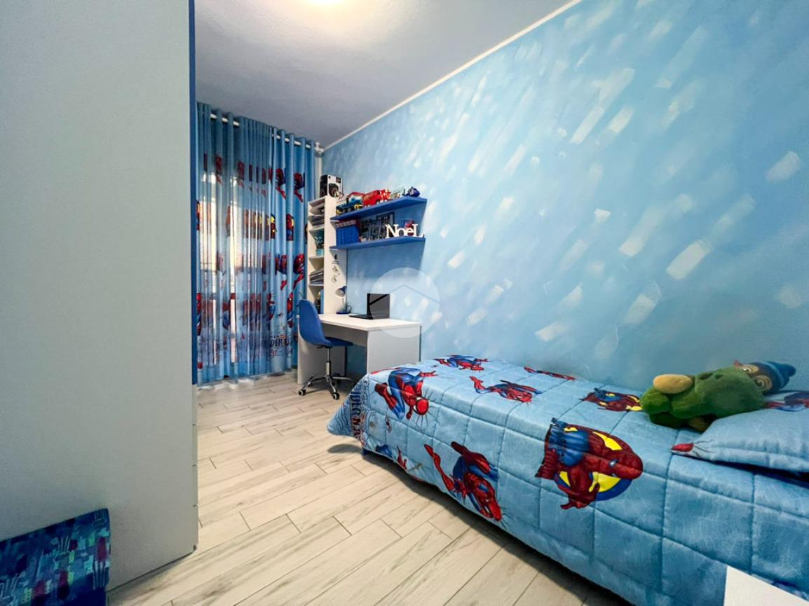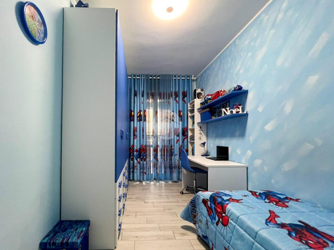 Un disimpegno conduce alla zona notte, composta da una camera singola, anch’essa con accesso alla terrazza, una spaziosa camera matrimoniale, un bagno finestrato con box doccia ed un pratico ripostiglio, attualmente adibito ad ulteriore cameretta.