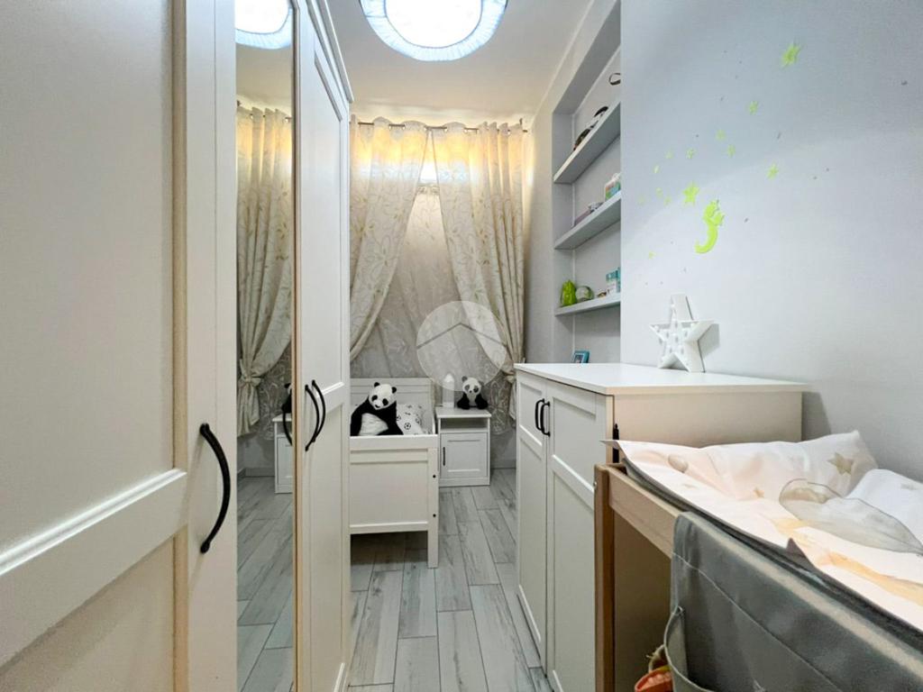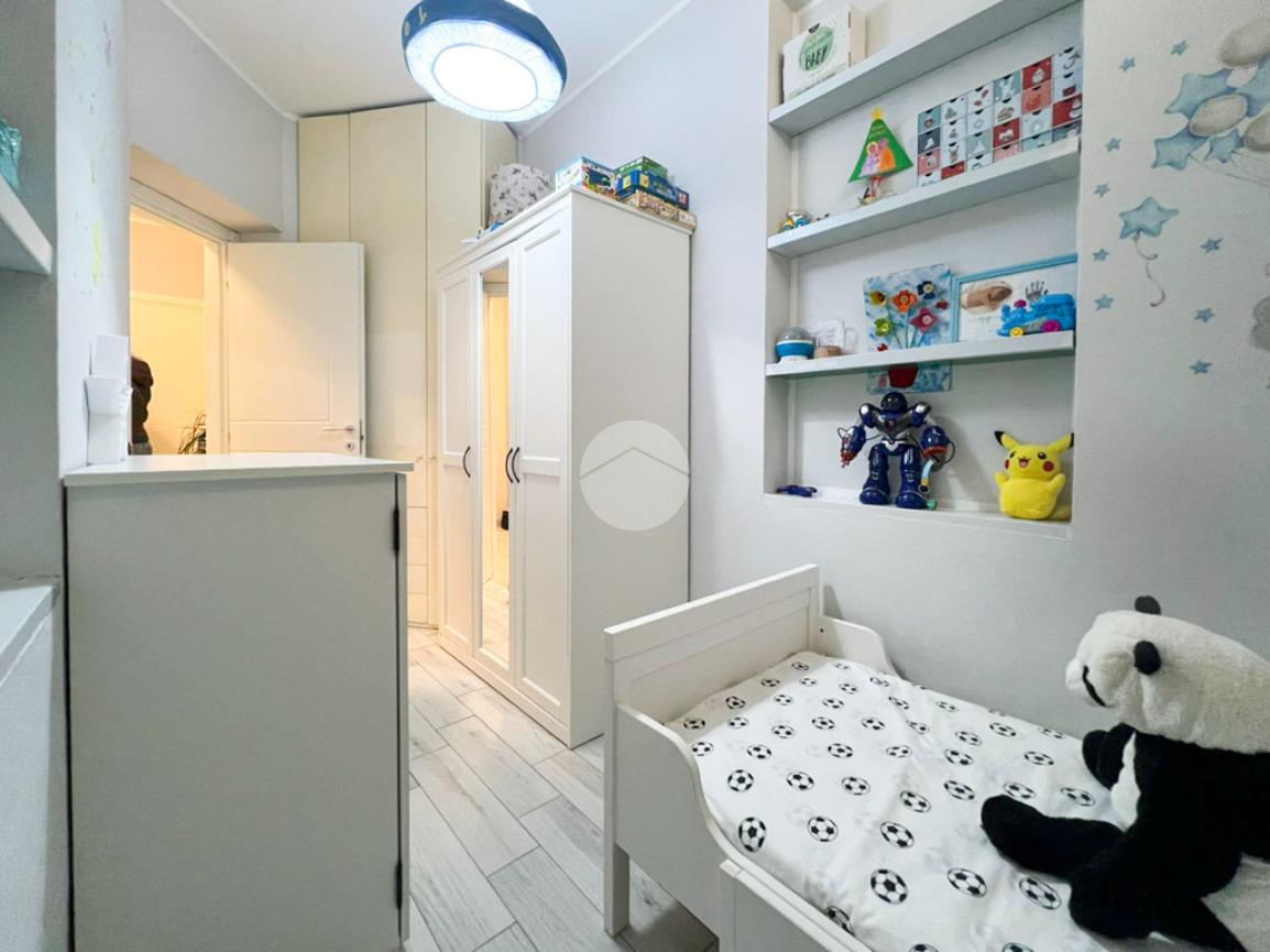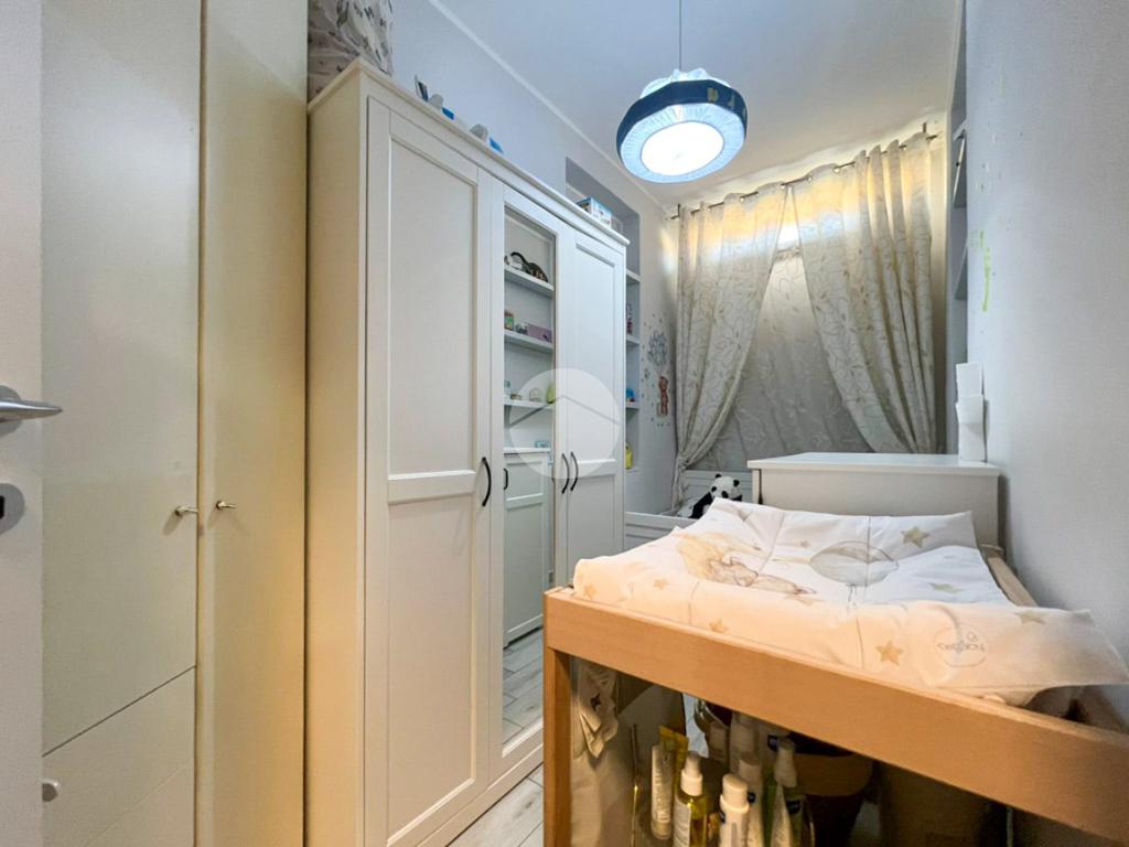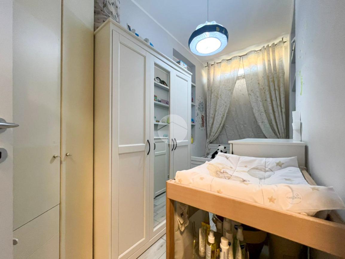 Un disimpegno conduce alla zona notte, composta da una camera singola, anch’essa con accesso alla terrazza, una spaziosa camera matrimoniale, un bagno finestrato con box doccia ed un pratico ripostiglio, attualmente adibito ad ulteriore cameretta.