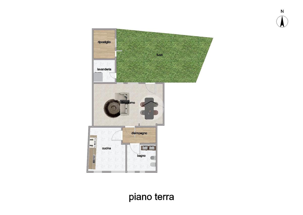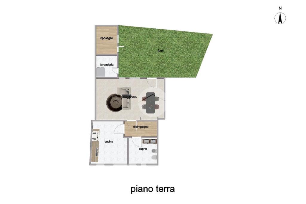 Al piano terra, un androne coperto consente di parcheggiare l’auto e conduce a un cortile privato di circa 45 mq sul retro, dove troviamo una lavanderia e un ripostiglio. L’ingresso dell’abitazione conduce alla zona giorno, composta da una cucina abitabile, un luminoso soggiorno con ampia vetrata affacciata sul cortile – accessibile direttamente da questa stanza – e un primo bagno finestrato con doccia.