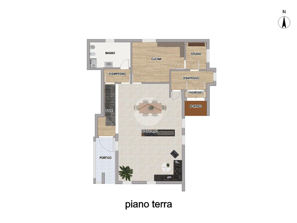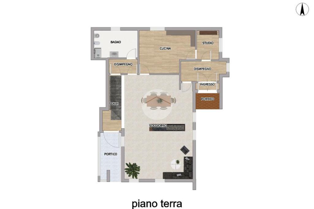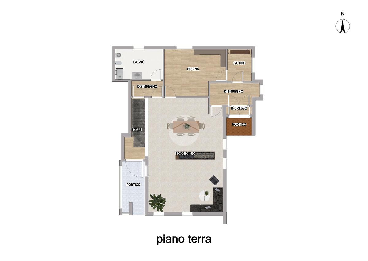 Dall’ingresso principale collocato al piano terra, tramite un disimpegno, si accede alla zona giorno composta dall’ampio living con camino e dalla sala da pranzo (il soggiorno presenta un dislivello per dividere i due ambienti); sullo stesso piano è presente la cucina abitabile che è dotata di un locale accessorio finestrato attualmente adibito a ripostiglio e che può essere sfruttato per l’ampliamento della cucina stessa o essere facilmente convertito in studio in quanto è dotato di accesso diretto dall’ingresso principale.