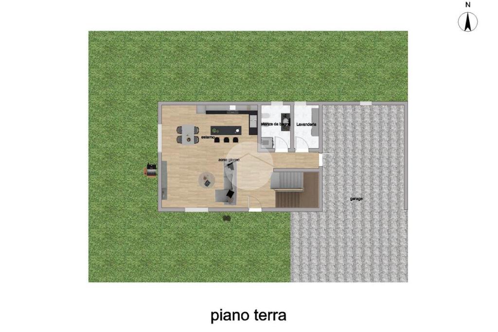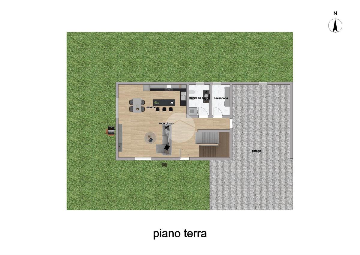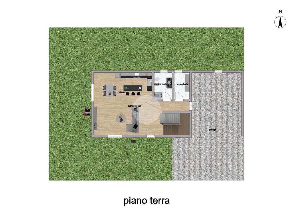 Al piano terra troviamo una spaziosa e luminosa zona giorno con accesso diretto al giardino privato, perfetto per momenti di relax all’aperto, oltre ad un bagno finestrato con box doccia ed una pratica zona lavanderia.