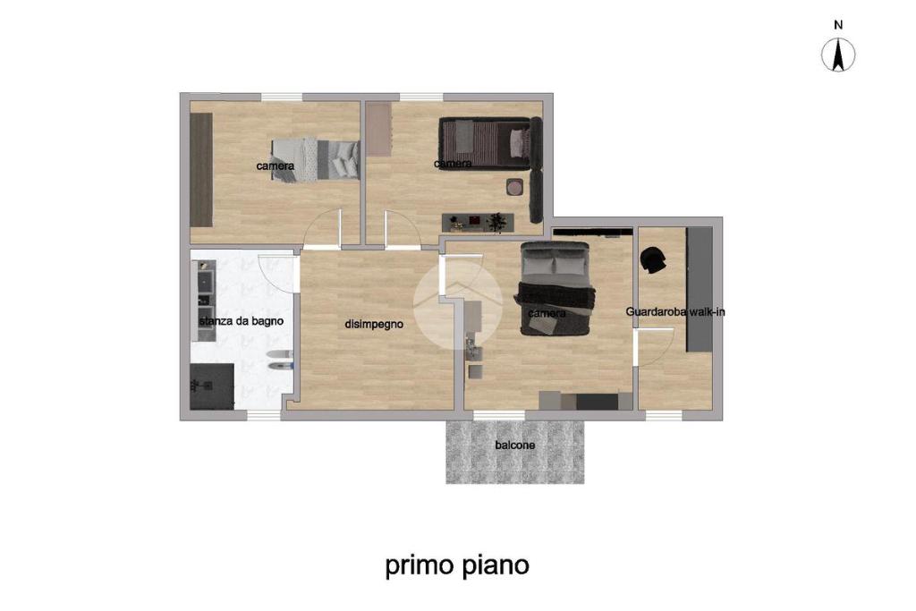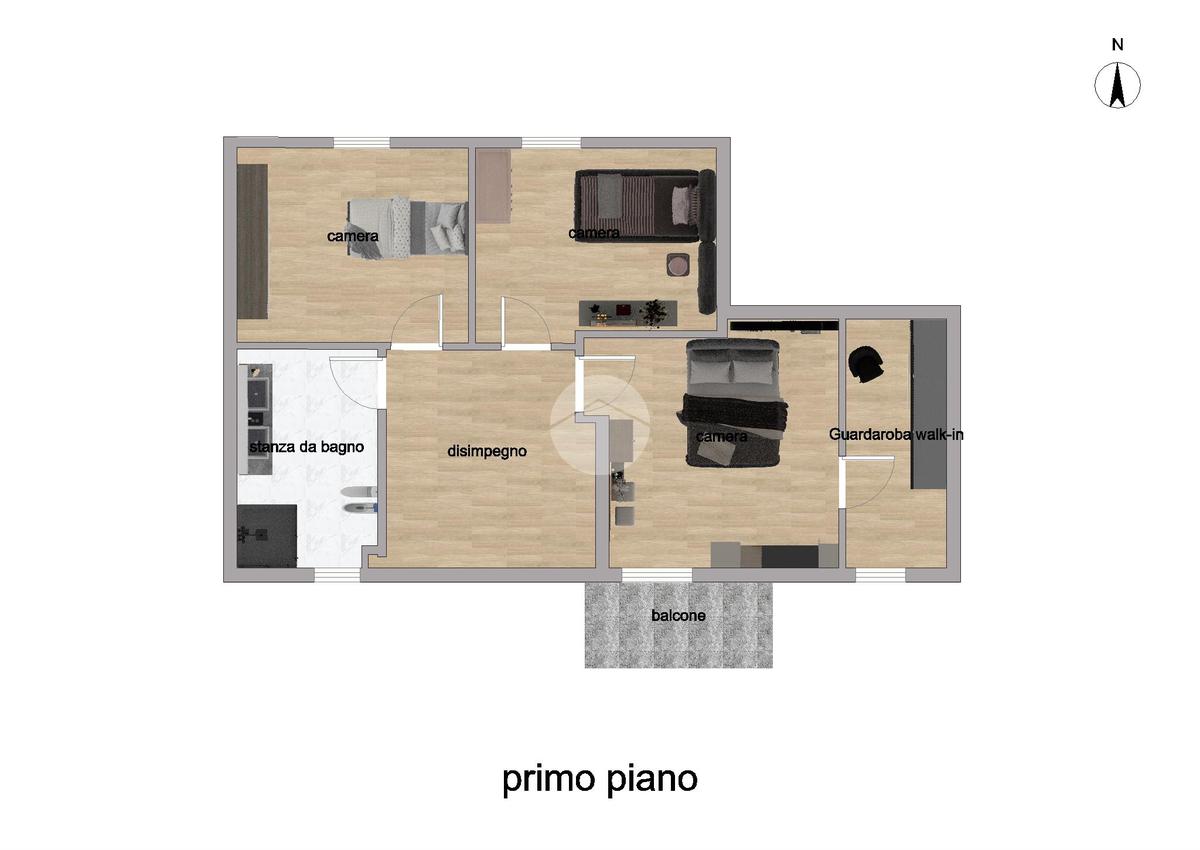 Al piano primo si sviluppa la zona notte, composta da tre camere da letto, un bagno finestrato con box doccia ed un balcone.